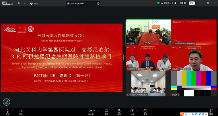 12月18日,我院与尼泊尔B.P.柯伊拉腊纪念肿瘤医院共同举办骨髓移植项目首次线上培训会,采用全英文方式交流。作为中尼骨髓移植(BMT)培训项目2025年度计划的重要环节,会议聚焦血液内科、核医学科、放疗科等骨髓移植相关学科,通过云端平台实现了高效、直接的国际专业对话,有力推动了中尼双方在骨髓移植技术领域的知识共享与能力提升。