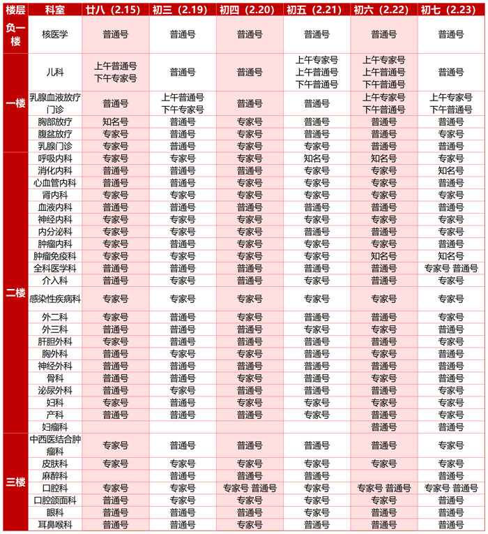 为保障春节假期的诊疗需求,2月15日(廿八)、2月19日(初三)-23日(初七),我院门诊、急诊照常运行,医疗服务“不停歇”,为您的健康保驾护航。各科室具体出诊时间、专家排班及注意事项均已详细列出,方便您随时查阅,以便高效、顺畅就诊。